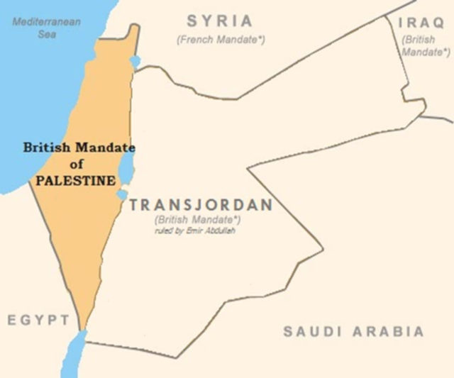 Om te begrijpen of deze internationaalrechtelijke term van toepassing is op een gebied als de Westelijke Jordaanoever, is de historische context belangrijk. In deze context is het relevant om terug te gaan naar het einde van de Eerste Wereldoorlog. Dit komt omdat de geallieerde naties van die tijd delen van het verslagen Ottomaanse Rijk verdeelden, waaronder het gebied waar de staat Israël zich vandaag de dag bevindt. Dat gebied werd onder Mandaat geplaatst met de goedkeuring van de voorloper van de Verenigde Naties (Volkenbond) in 1920/1922, met het Britse Rijk als “Mandataris”. Simpel gezegd moest de Britse regering het Mandaatgebied voorbereiden op onafhankelijk bestuur, zodat er later een Joodse staat kon worden gesticht. Dat gebied zag er uiteindelijk als volgt uit (oranje):